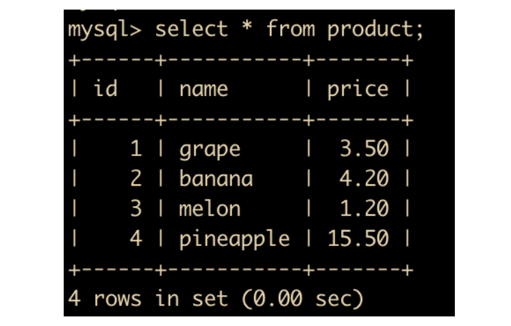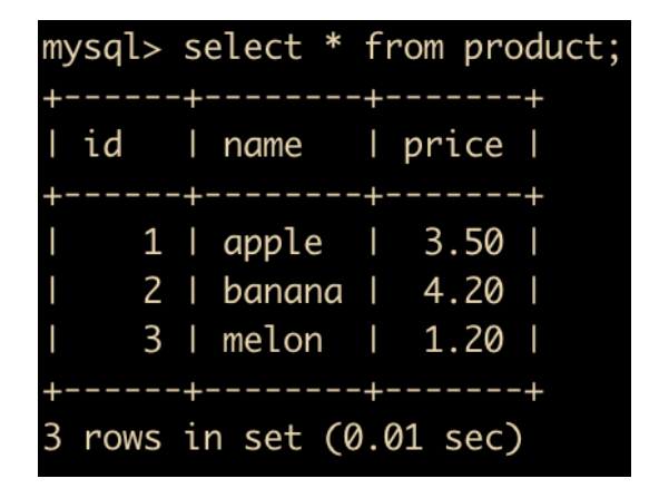 insert into product values(1, "apple","3.5"),(2,"banana","4.2"),(3,"melon","1.2");