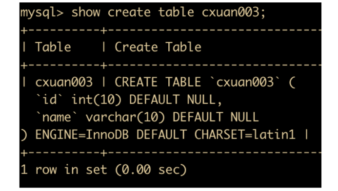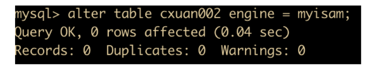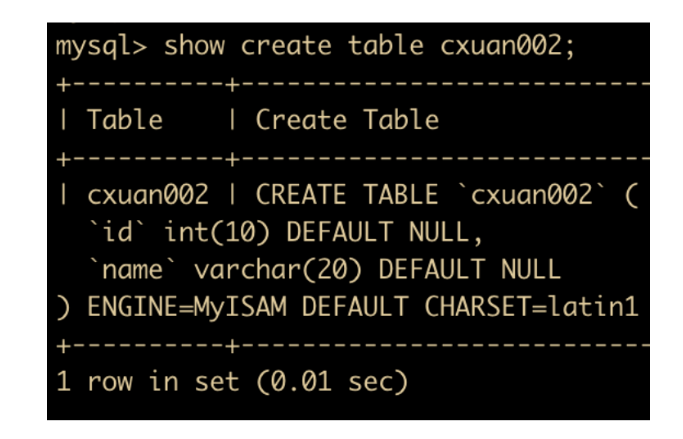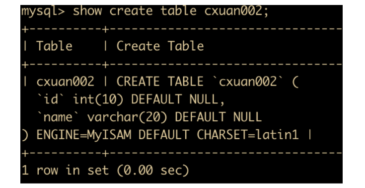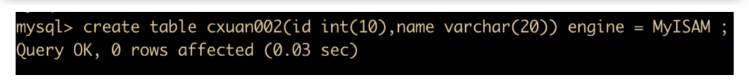 ENGINE 关键字设置新建表的存储引擎。create table cxuan002(id int(10),name varchar(20)) engine = MyISAM;