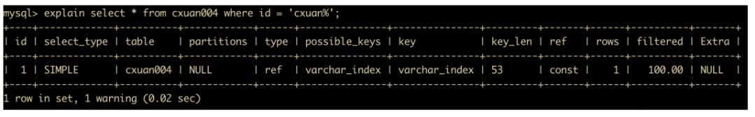 explain 进行分析,可以看到 cxuan004 使用索引的情况