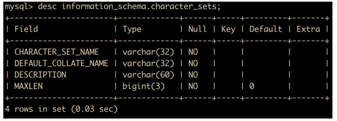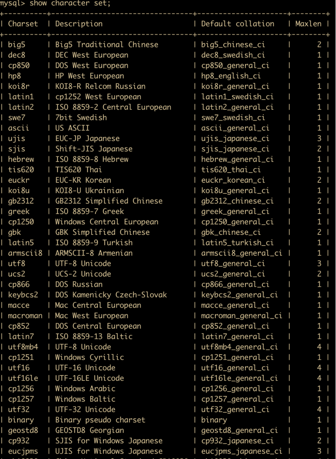 select character_set_name, default_collate_name, description, maxlen from information_schema.character_sets;