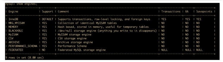 MyISAM InnoDB BDB MEMORY MERGE EXAMPLE NDB Cluster ARCHIVE CSV BLACKHOLE FEDERATED