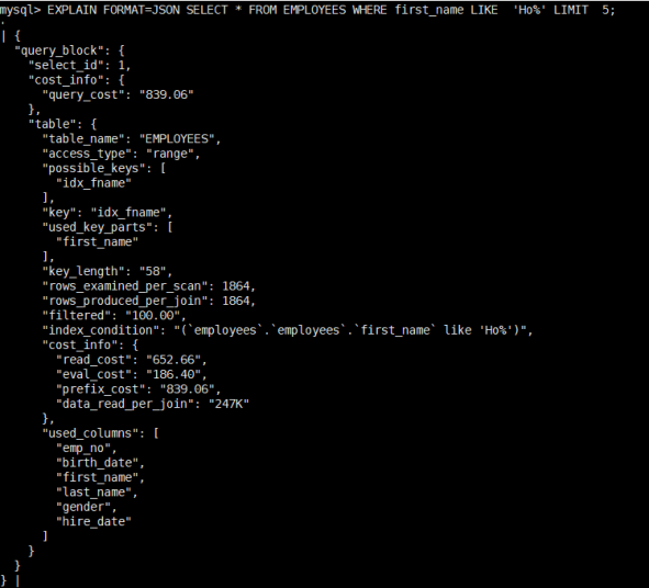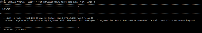 mysql> show variables like '%profiling%';+------------------------+-------+| Variable_name | Value |+------------------------+-------+| have_profiling | YES || profiling | OFF || profiling_history_size | 15 |+------------------------+-------+mysql> SET profiling = 1;Query OK, 0 rows affected, 1 warning (0.00 sec)mysql> SELECT * FROM employees WHERE first_name like 'Ho%' limit 5;+--------+------------+------------+-----------+--------+------------+| emp_no | birth_date | first_name | last_name | gender | hire_date |+--------+------------+------------+-----------+--------+------------+| 11105 | 1956-12-17 | Holgard | McAlpine | M | 1990-01-13 || 11484 | 1959-04-08 | Holgard | Siepmann | M | 1995-01-22 || 15162 | 1960-05-01 | Holgard | Koblitz | F | 1990-08-07 || 16372 | 1961-02-12 | Holgard | Terkki | M | 1991-06-08 || 16374 | 1963-05-23 | Holgard | Nergos | F | 1987-05-21 |+--------+------------+------------+-----------+--------+------------+5 rows in set (0.00 sec)mysql> SHOW PROFILES;+----------+------------+-------------------------------------------------------------+| Query_ID | Duration | Query |+----------+------------+-------------------------------------------------------------+| 1 | 0.00568950 | SELECT * FROM employees WHERE first_name like 'Ho%' limit 5 |+----------+------------+-------------------------------------------------------------+1 row in set, 1 warning (0.00 sec)mysql> SHOW PROFILE FOR QUERY 1;+--------------------------------+----------+| Status | Duration |+--------------------------------+----------+| starting | 0.004549 || Executing hook on transaction | 0.000030 || starting | 0.000016 || checking permissions | 0.000319 || Opening tables | 0.000055 || init | 0.000008 || System lock | 0.000009 || optimizing | 0.000011 || statistics | 0.000071 || preparing | 0.000205 || executing | 0.000357 || end | 0.000007 || query end | 0.000005 || waiting for handler commit | 0.000011 || closing tables | 0.000008 || freeing items | 0.000022 || cleaning up | 0.000010 |+--------------------------------+----------+17 rows in set, 1 warning (0.00 sec)