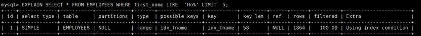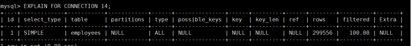 ##session1mysql> SELECT CONNECTION_ID();+-----------------+| CONNECTION_ID() |+-----------------+| 14 |+-----------------+1 row in set (0.00 sec)mysql> select * from employees;#session2mysql> EXPLAIN FOR CONNECTION 14;+----+-------------+-----------+------------+------+---------------+------+---------+------+--------+----------+-------+| id | select_type | table | partitions | type | possible_keys | key | key_len | ref | rows | filtered | Extra |+----+-------------+-----------+------------+------+---------------+------+---------+------+--------+----------+-------+| 1 | SIMPLE | employees | NULL | ALL | NULL | NULL | NULL | NULL | 299556 | 100.00 | NULL |+----+-------------+-----------+------------+------+---------------+------+---------+------+--------+----------+-------+