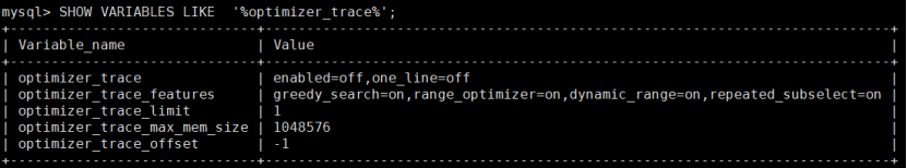 optimizer_trace:enabled:启用/禁用optimizer_trace功能 , one_line:决定了跟踪信息的存储方式,为on表示使用单行存储,否则以JSON树的标准展示形式存储。 optimizer_trace_features:该变量中存储了跟踪信息中可控的打印项,可以通过调整该变量,greedy_search,range_optimizerdynamic_range,repeated_subselect optimizer_trace_max_mem_size :optimizer_trace内存的大小,如果跟踪信息超过这个大小,信息将会被截断 optimizer_trace_offset:则是约束偏移量。和 LIMIT 一样,optimizer_trace_offset 从0开始计算