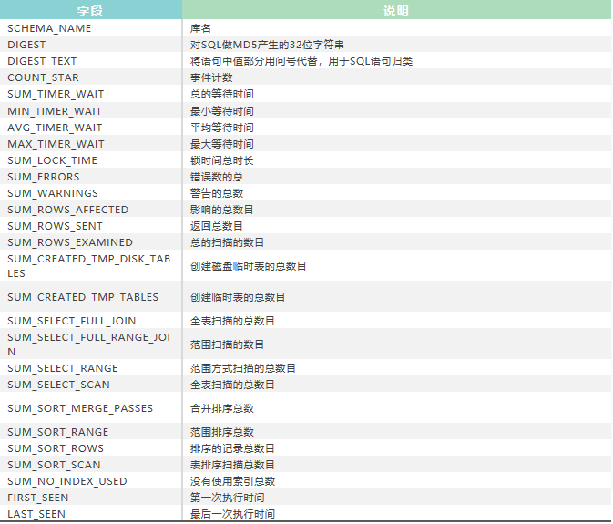 events_statements_summary_by_digest:sql语句汇总统计数据,表结构说明如下: