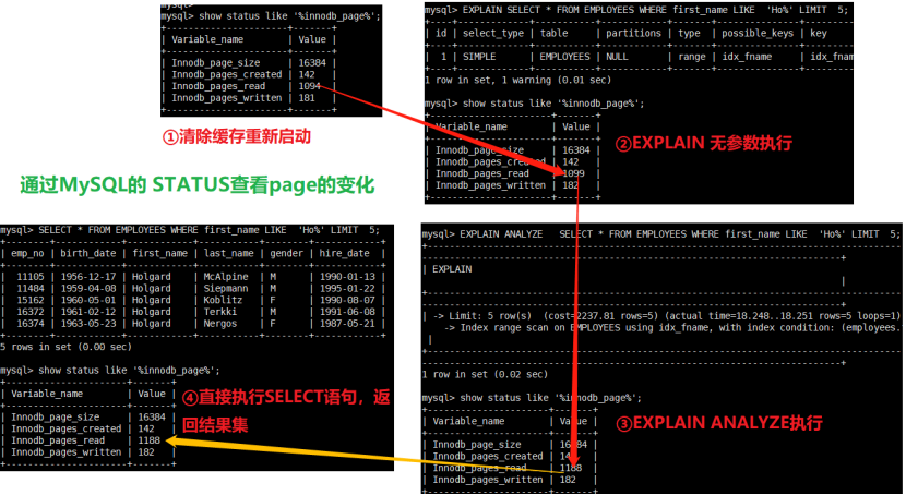 备注:结果集显示里多了actual time。为了确认这个是否实际成本。通过status观察值,EXPLAIN ANALYZE之后 实际执行SELECT时 page是否也没变化。