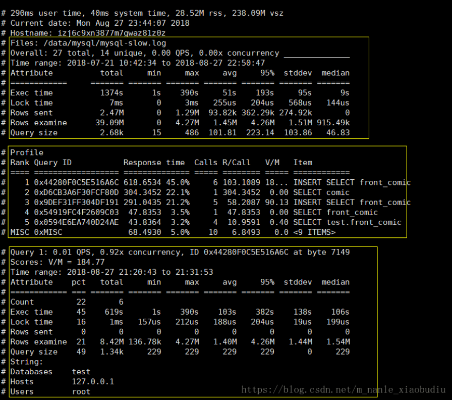 第一部分:显示出了日志的时间范围,以及总的sql数量和不同的sql数量。